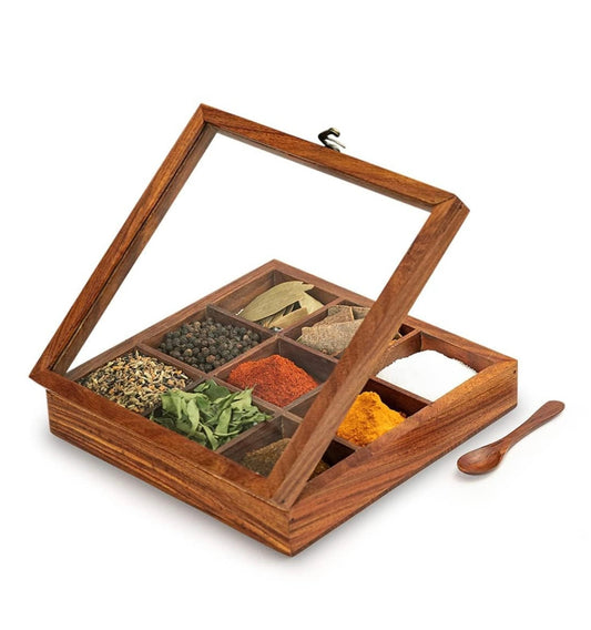 Premium Wooden Spice Box with 9 Compartments | Masala Organizer with Spoon & Transparent Lid | Traditional Indian Masala Dabba for Kitchen Storage
